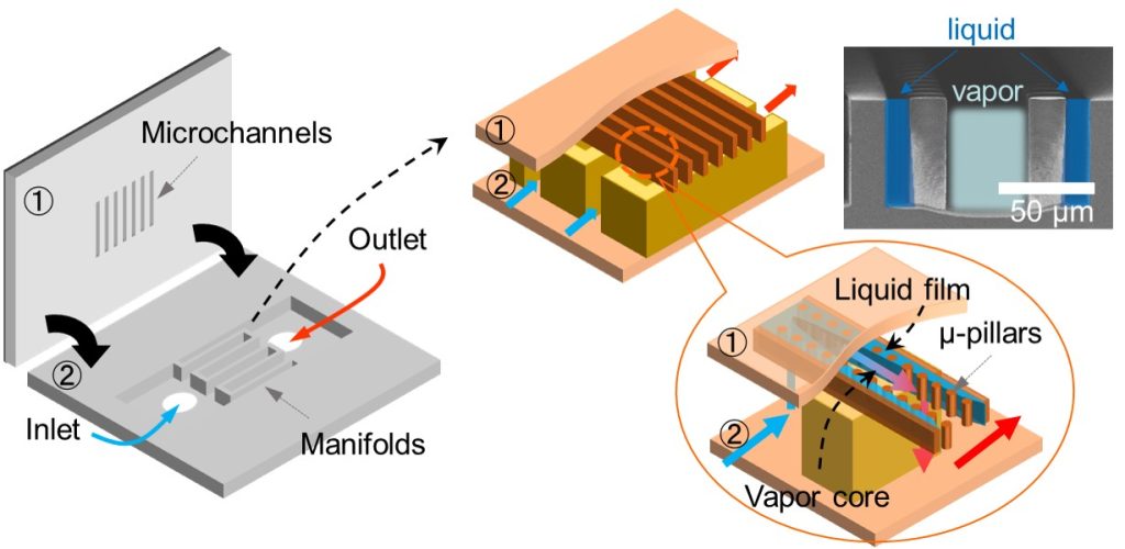 先端半導体は、より高速で省エネな3次元構造に向かって開発が進められています。HBMがGPUの直情に積まれるため、高性能化のためには放熱技術の向上が不可欠です。当研究室では、① 三次元マイクロ流路を用いた水冷技術と② AlN絶縁膜を用いた高放熱半導体チップの実現に関する研究を行っています。特に、①では、シリコンチップ内部にマイクロ流路を形成し、微量の冷却水を注入し、沸騰による気化熱を用いた二相冷却により、COP(性能指数)が105を超える世界最高レベルの効率での半導体チップ冷却を実現しています。
